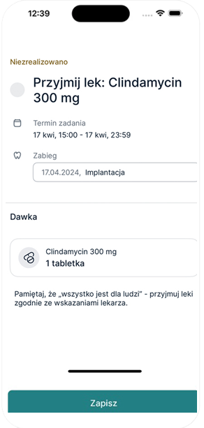 Pacjent Implantologiczny,, Dzięki aplikacji pamiętałem o stosowaniu wszystkich lekarstw, po wystąpieniu obrzęku dostałem dokładne informacje o tym co robić dalej, bez konieczności dodatkowej wizyty "
