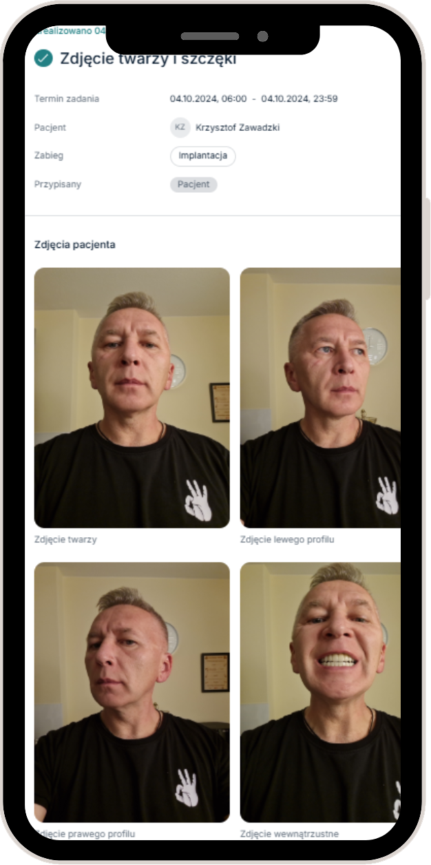W aplikacji łatwo wykonasz zdjęcia wewnątrz- i zewnątrzustne, które pomogą dokumentować proces gojenia. Możesz przesyłać zdjęcia bezpośrednio do aplikacji, aby lekarz mógł na bieżąco monitorować Twój stan.