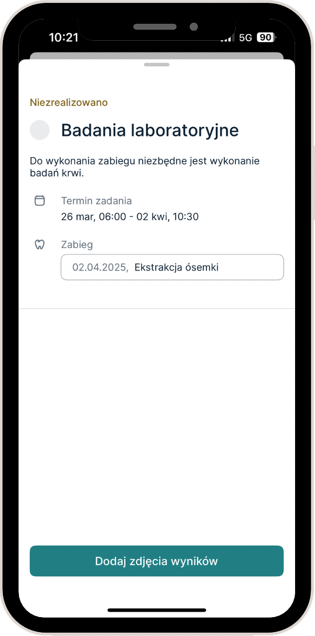W aplikacji znajdziesz szczegółowe informacje na temat odbytych i zaplanowanych zabiegów. Będziesz mieć stały dostęp do historii leczenia, a także pełną wiedzę o tym, co jeszcze Cię czeka.