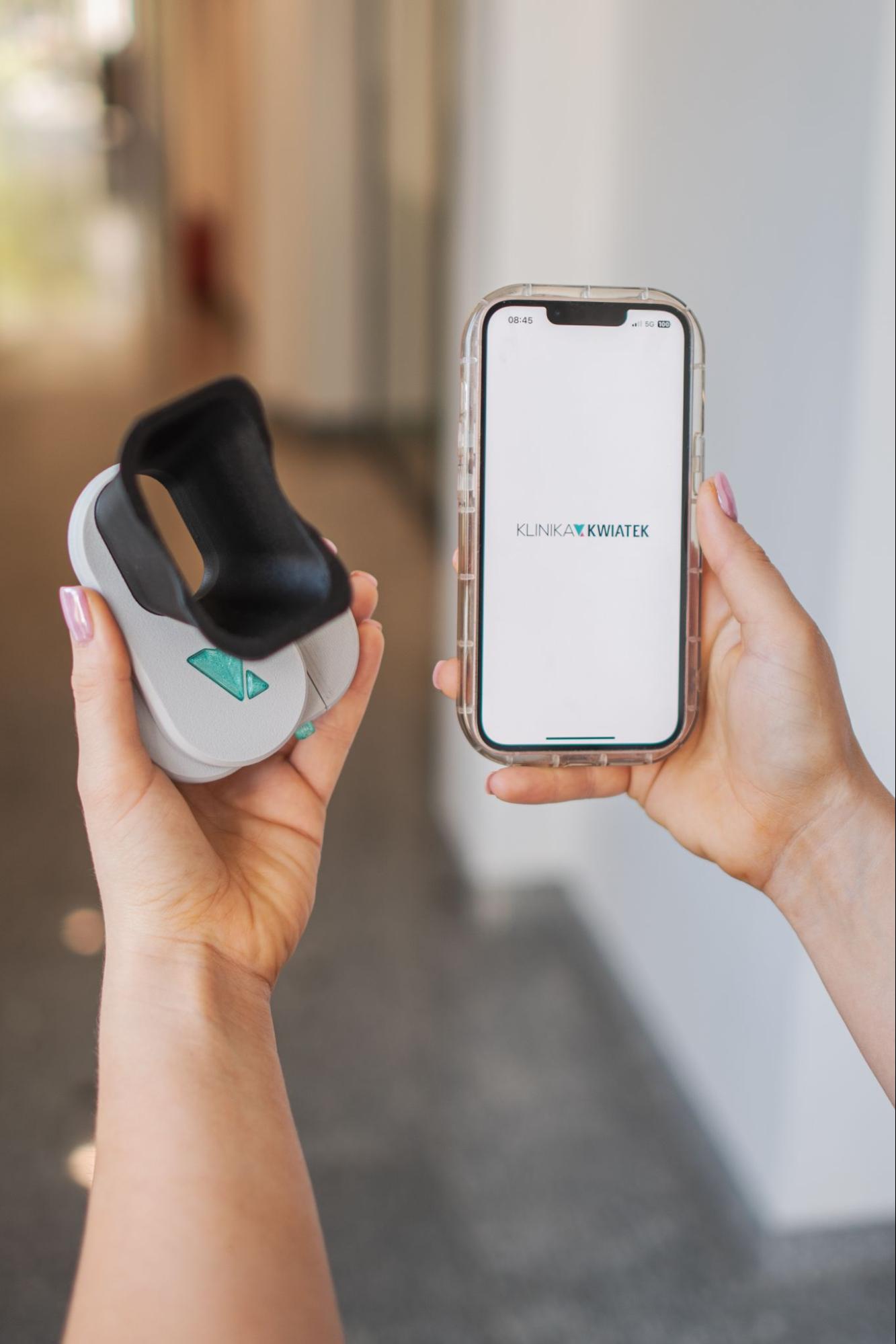 Pacjent wykonuje zdjęcia wewnątrzustne przy pomocy indywidualnie zaprojektowanego retraktora, który można zamontować na każdy model smartfona.